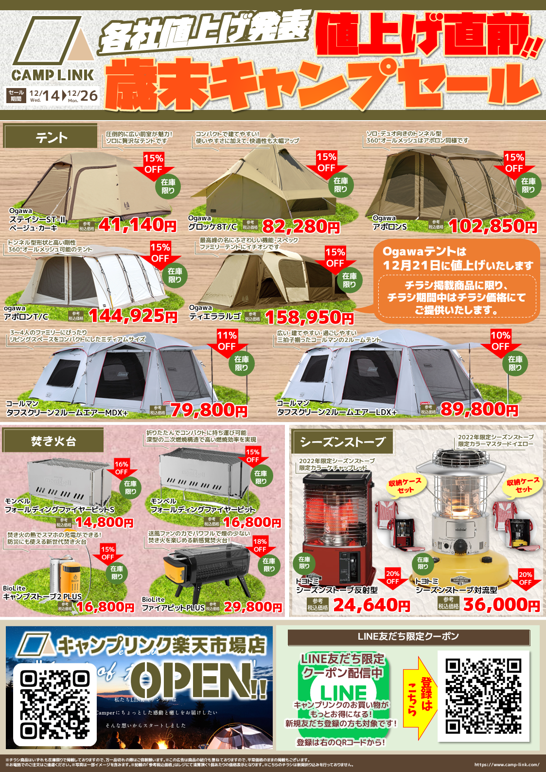 12月14日~26日WEBチラシ「歳末キャンプセール」のお知らせ