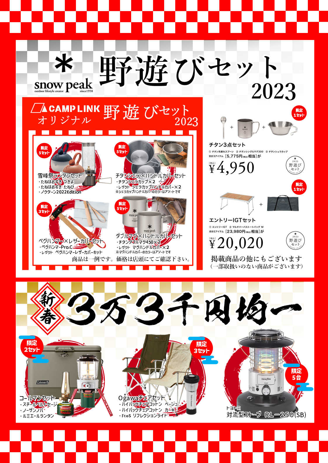 スノーピーク商品がセットでお得な福箱「野遊びセット2023」はキャンプリンクでも取扱いいたします(一部取扱いのない商品がございます)。