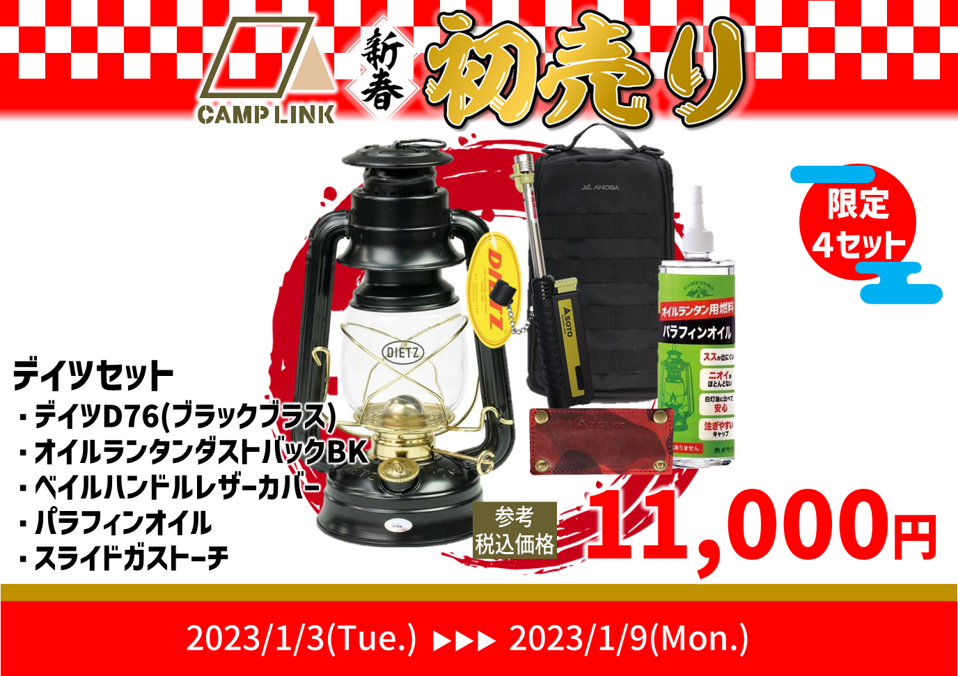 デイツD76(ブラック×ブラス)+オイルランタンダストバッグBK+ベイルハンドルレザーカバー+パラフィンオイル+スライドガストーチがセットで1万1千円