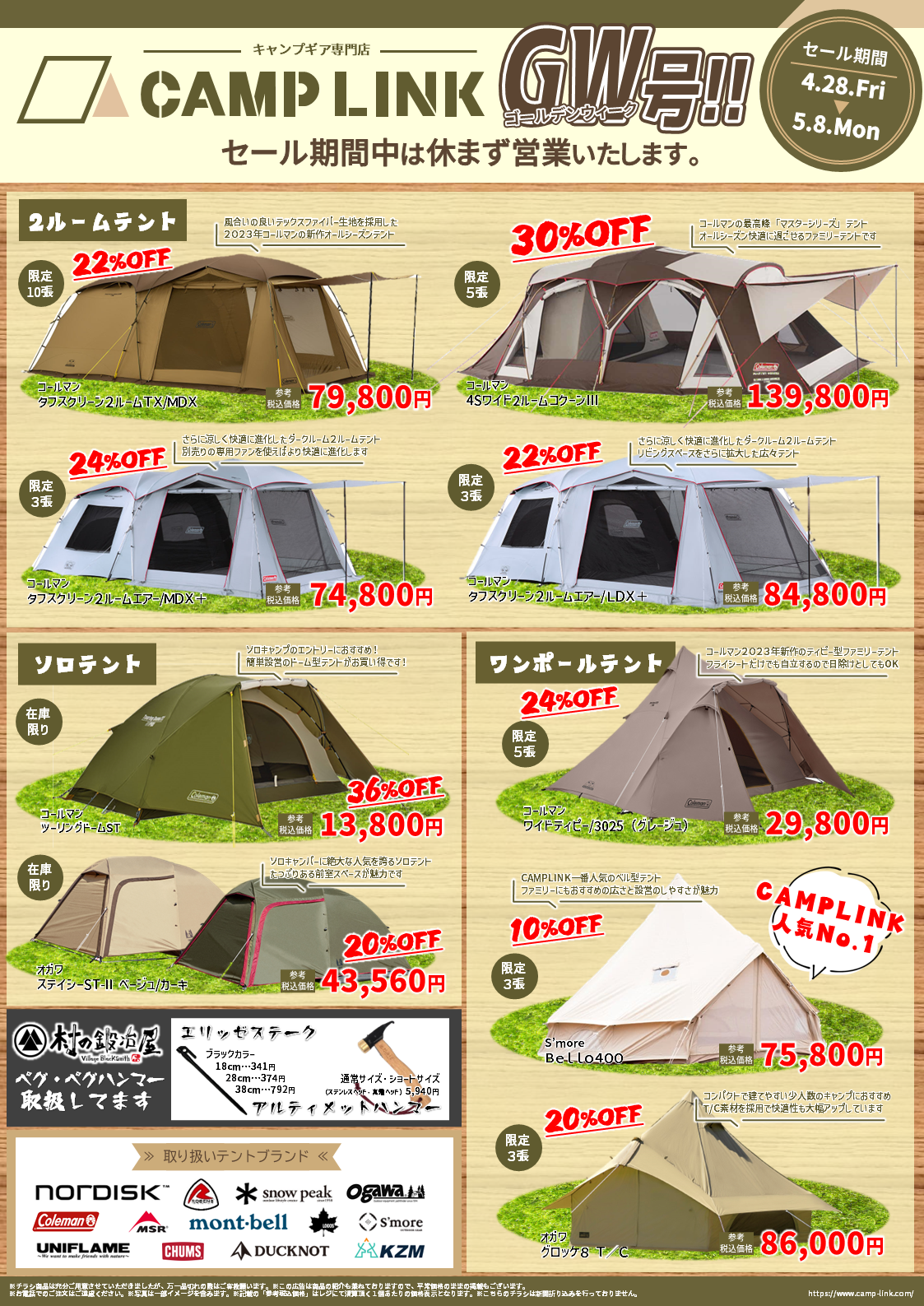 ゴールデンウィークセールならではのお買い得テントをご用意いたしました。
