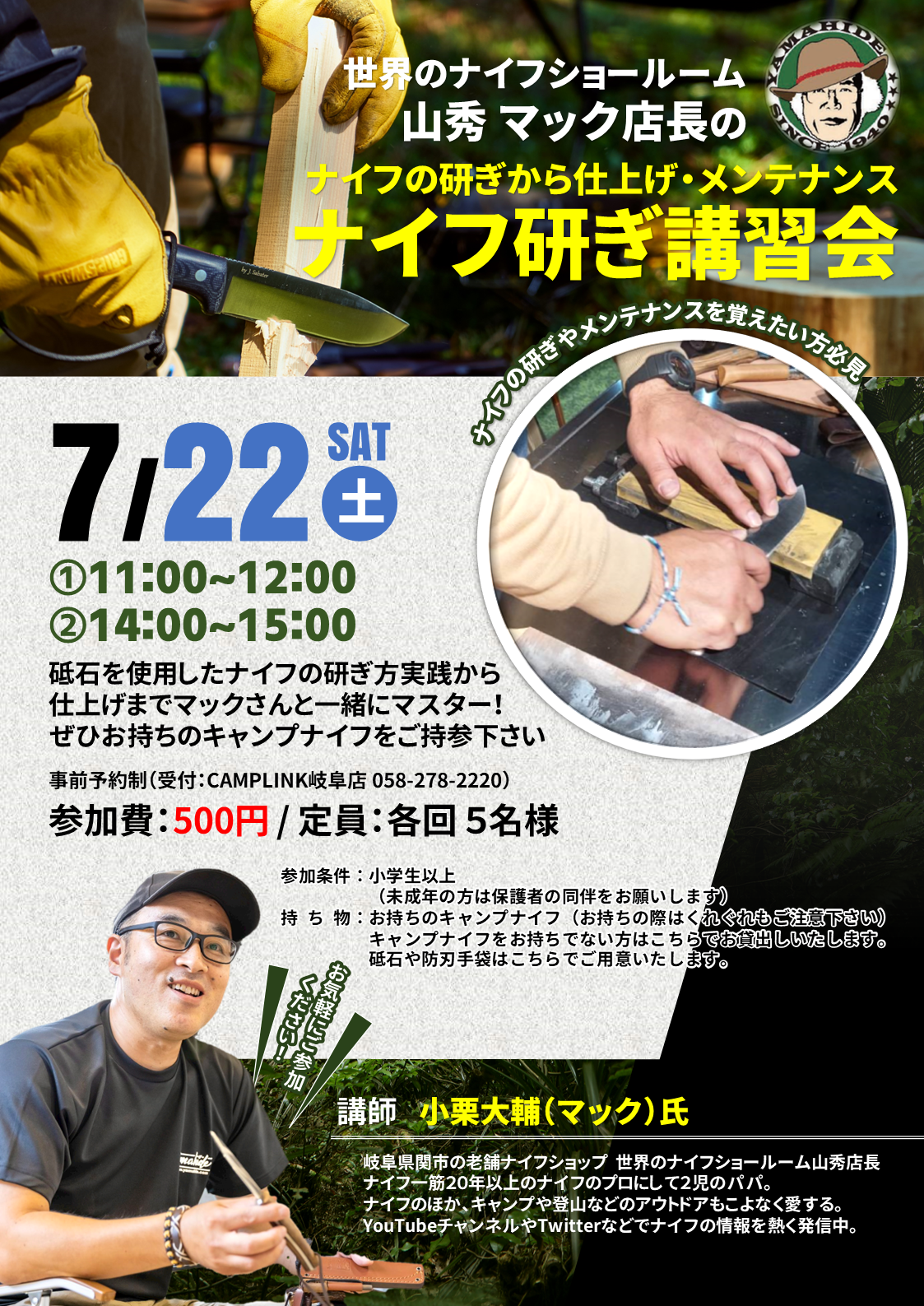 7/22(土)開催 山秀マック店長 ナイフ研ぎ講習会のお知らせ