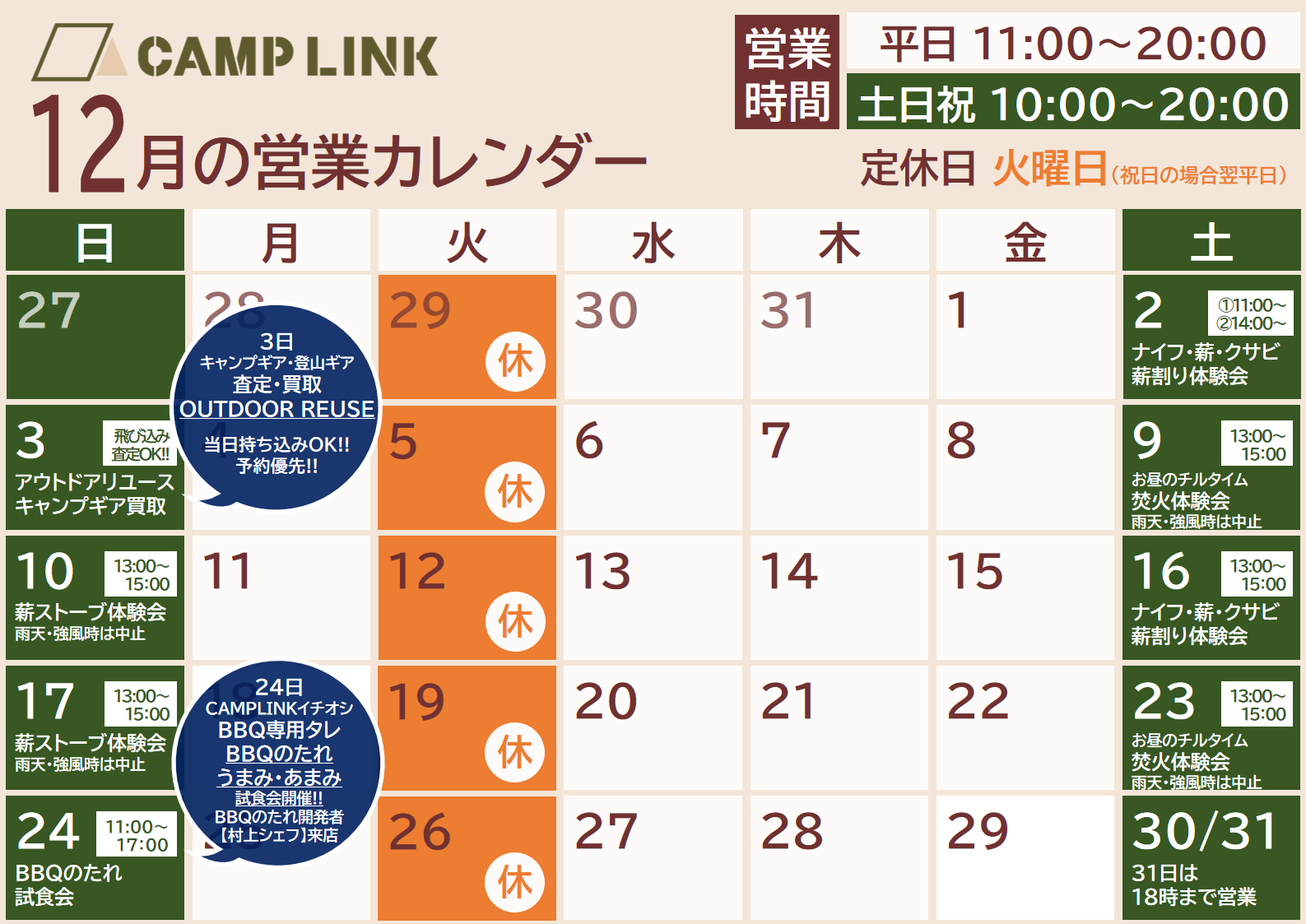 2023年12月の営業カレンダー・イベントスケジュールは下記のとおりです。