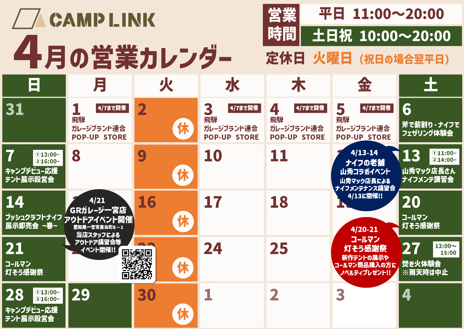 2024年4月の営業カレンダー・イベントスケジュールは下記のとおりです。