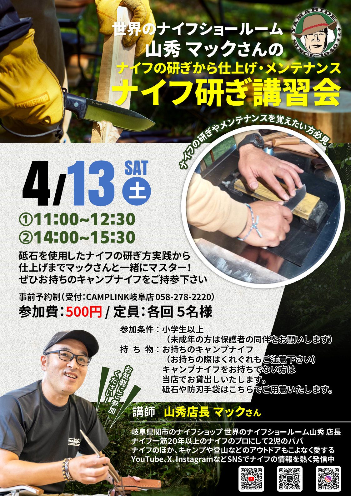 【予約】CAMPLINK岐阜店店舗(058-278-2220)にお電話下さい。「ナイフ研ぎ講習会の参加」とお伝えください。