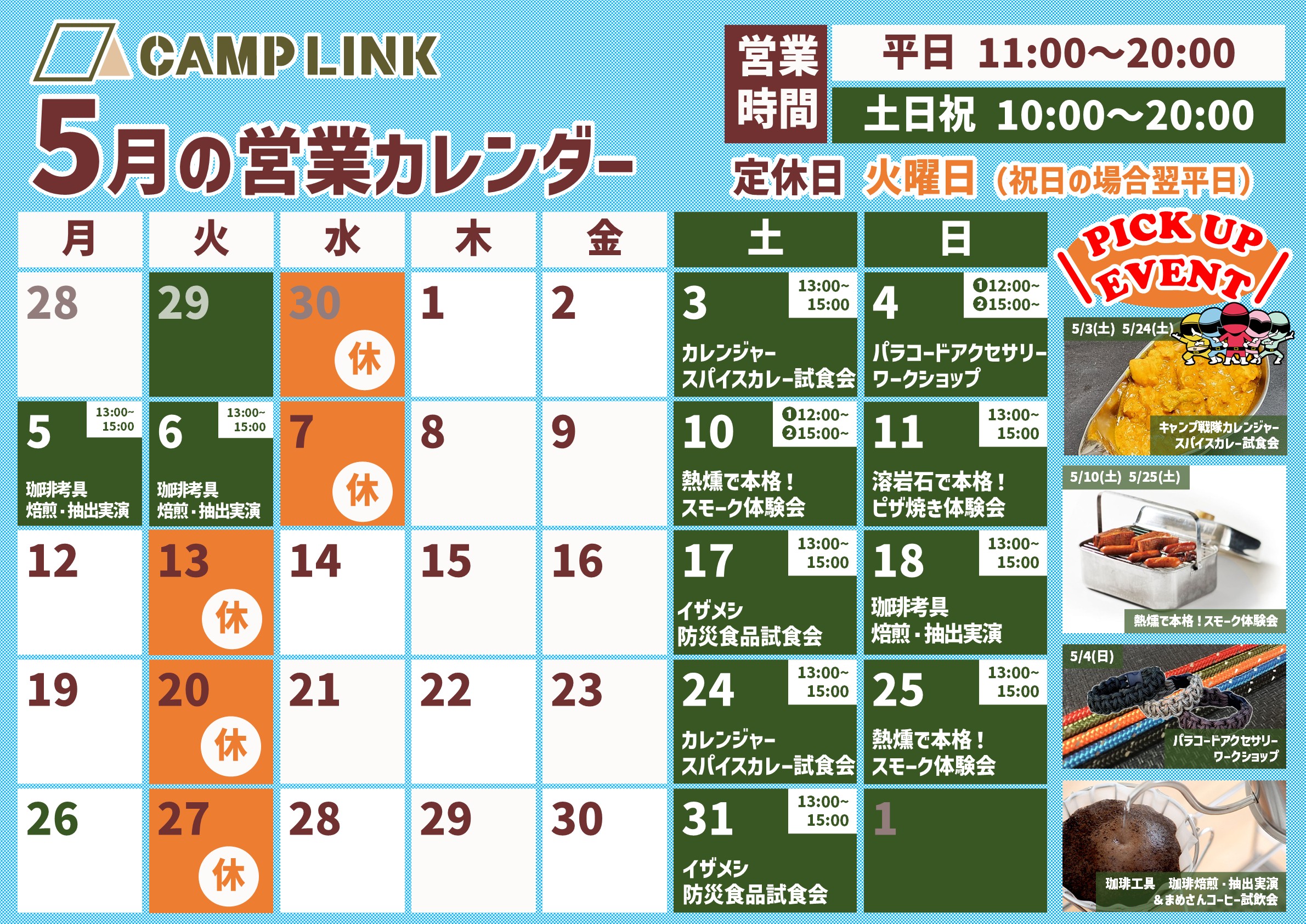 2025年5月の営業カレンダー・イベントスケジュールは下記のとおりです。