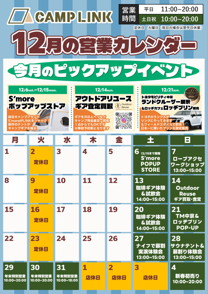 2025年12月の営業カレンダー・イベントをご案内いたします