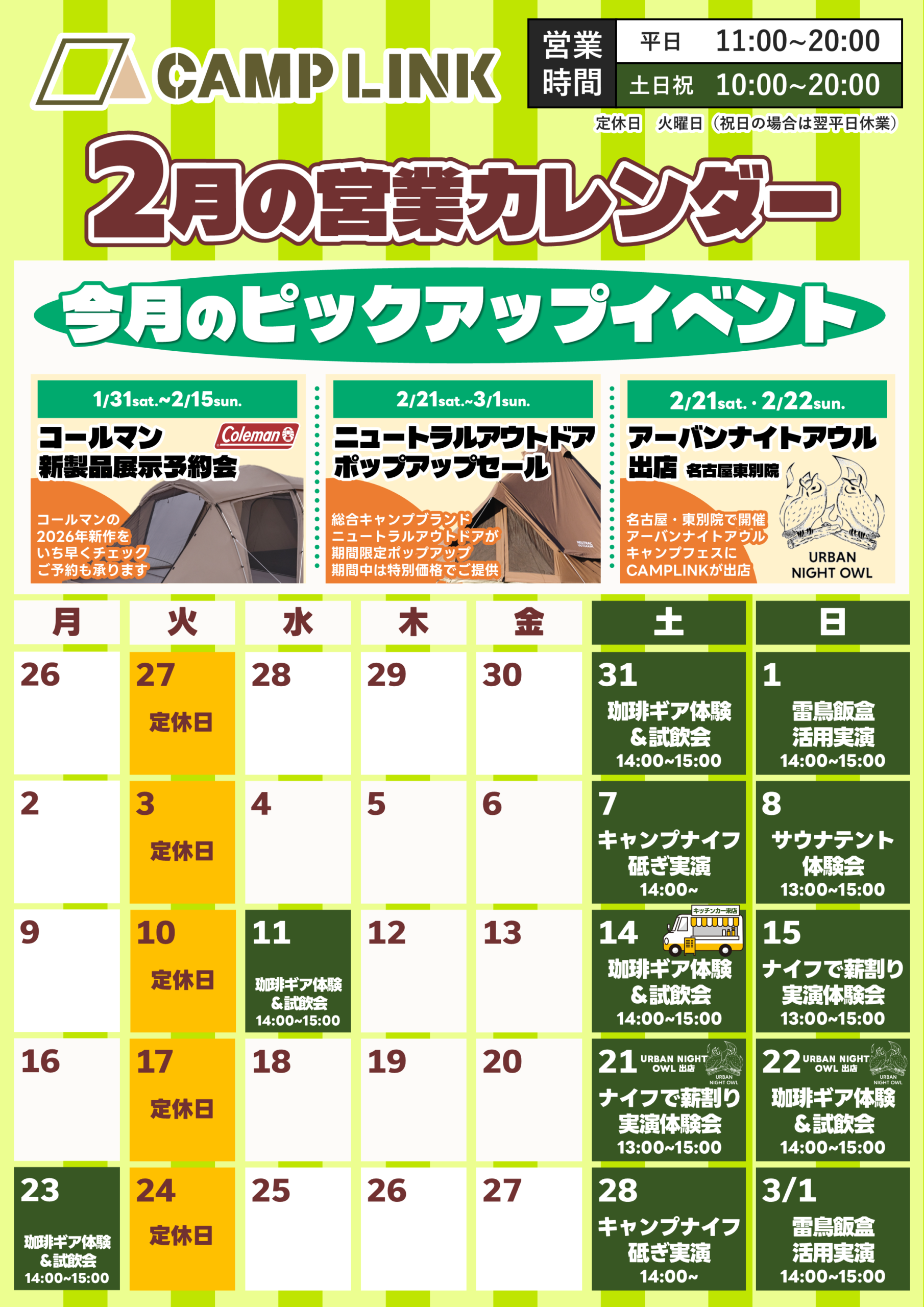 2026年2月の営業カレンダー・イベントをご案内いたします