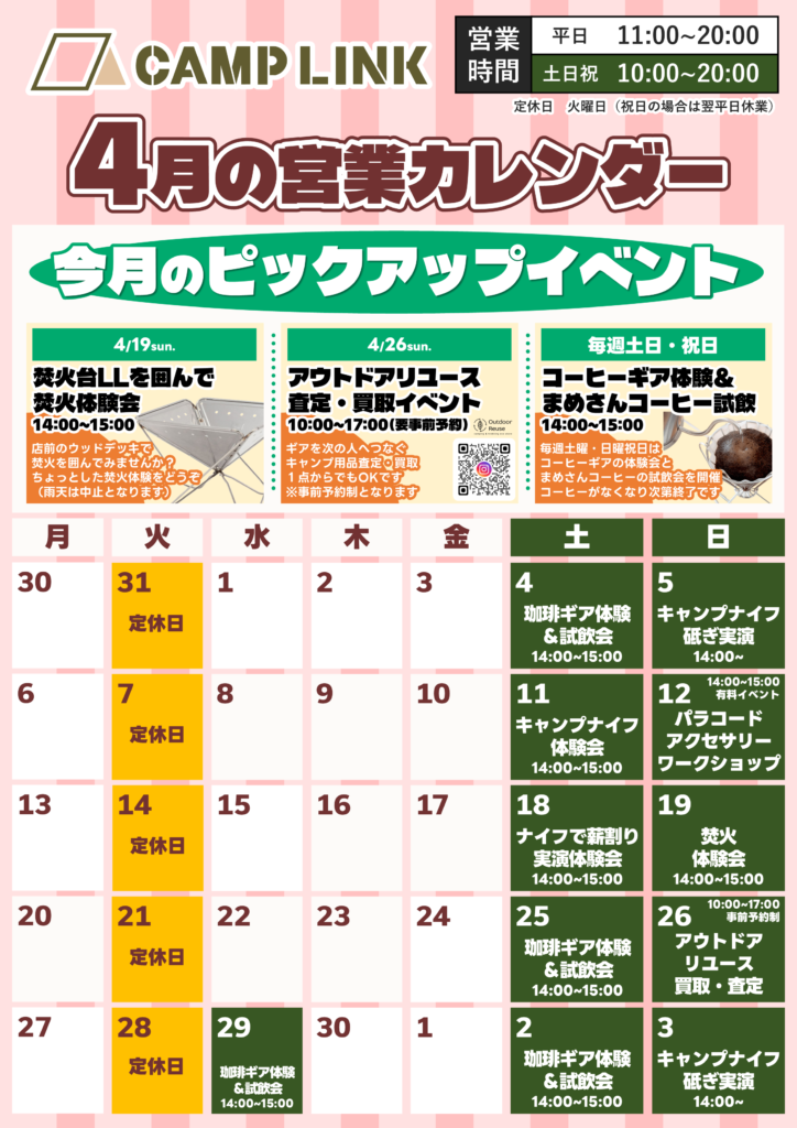2026年4月の営業カレンダー・イベントをご案内いたします